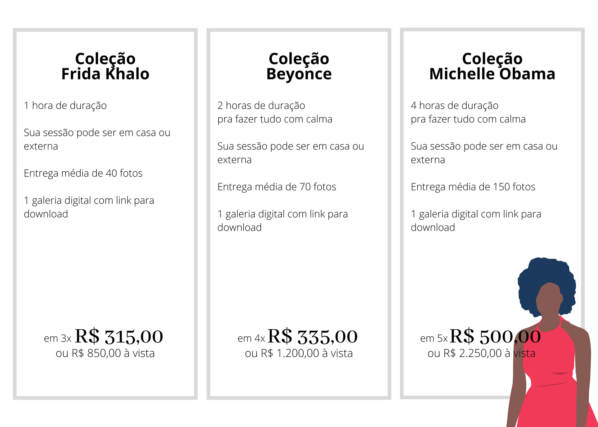 R: Não estão inclusos maquiagem, locação caso seja paga, roupas, produção e deslocamento.
