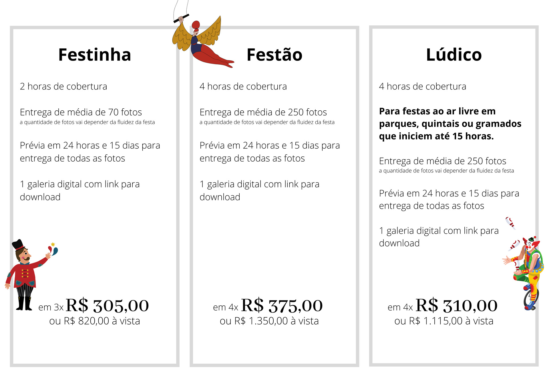 Durante a festa estarei registrando tudo, desde os pequenos detalhes da decoração até o momento tão esperado dos parabéns. Estarei sempre atenta aos sorrisos, abraços, carinhos e momentos especiais para vocês e as pessoas que são importantes na vida do seu filho.