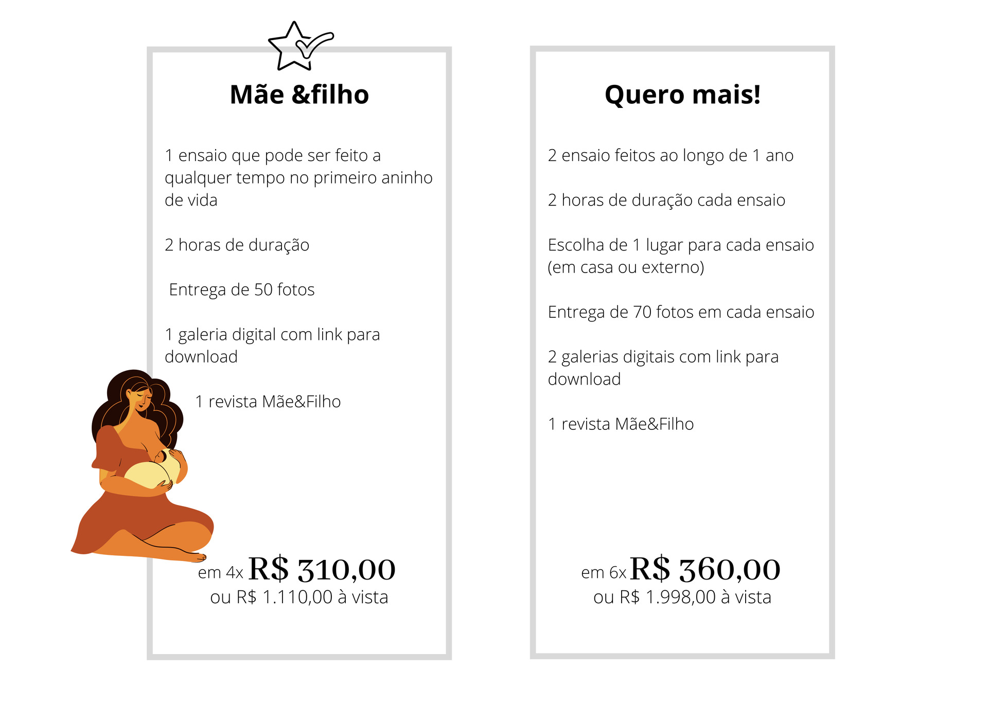 R: Nosso ensaio Mãe&filho é de até 2 horas pensando nas necessidades mãe e bebê, sabendo que pode haver algum atraso e com tempo de sobra para fazer o ensaio com toda calma do mundo. Nossa maior preocupação é o bem estar de vocês.