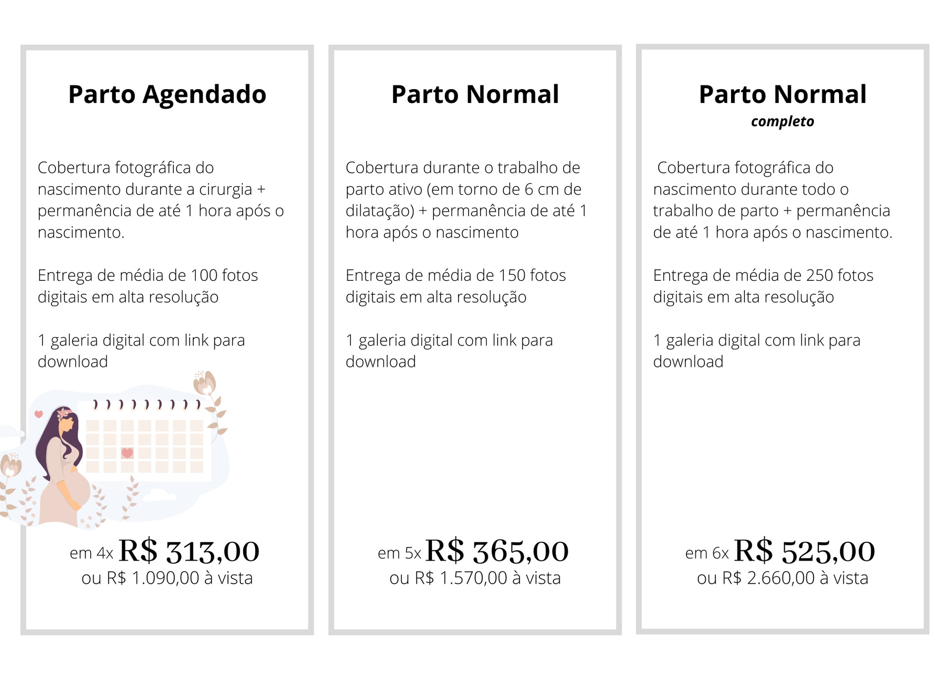 R: Primeiro passo será verificar a disponibilidade da agenda da fotógrafa de acordo com a DPP da gestante. A partir daí com base na decisão de forma de parto definimos o plano e a forma de pagamento para formalizar.
